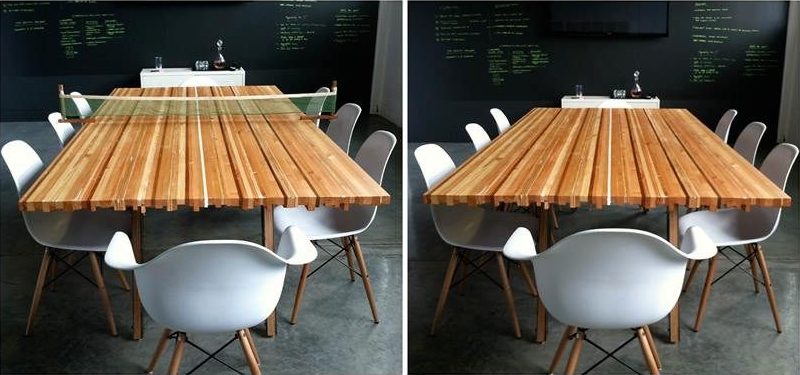 Just add a net and this conference turns into a ping pong battle. The table is built to regulation size ping pong table with a white painted wood strip down the center.