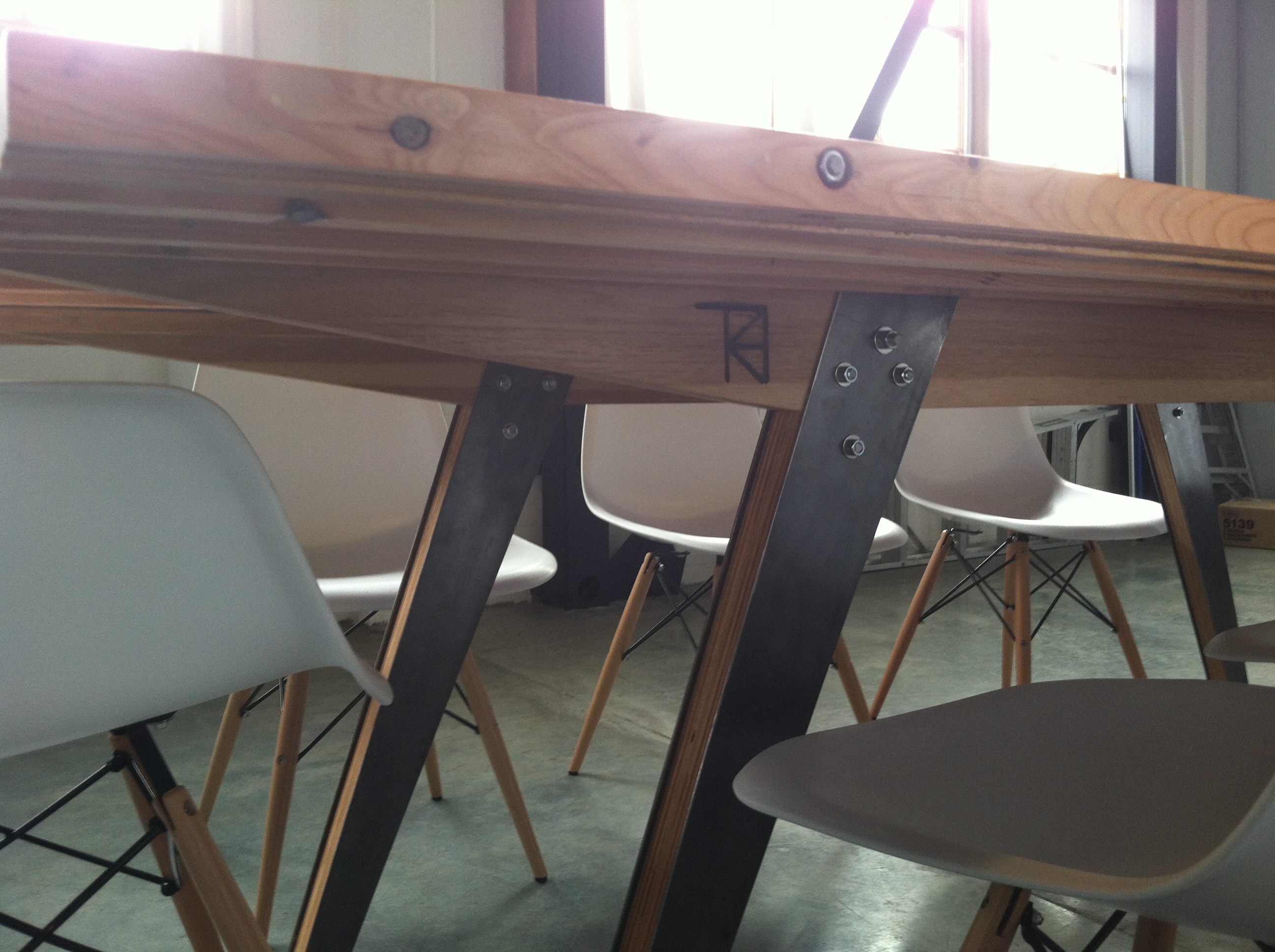 Reclaimed wood from retired building materials. Plywood. 1/8" Steel legs.